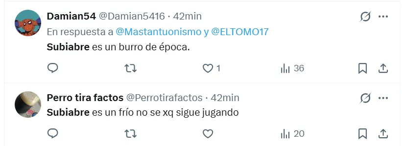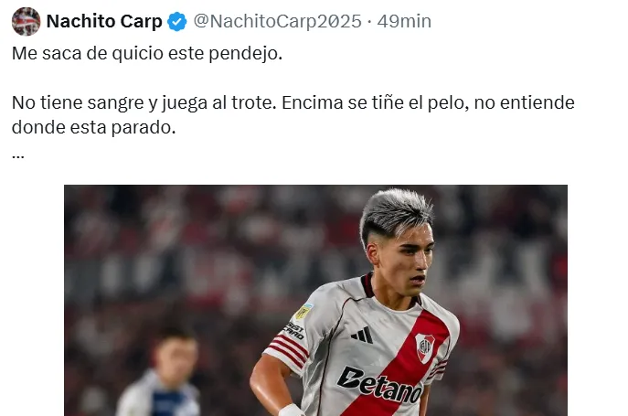 “En su cabeza es Messi, no hay chance que juegue con tanta displicencia”, “menos tintura y más fútbol“, “no tiene sangre y juega al trote, no entiende donde está parado”, “juega como si tuviera 2 Libertadores ganadas”, “se cae en todas las jugadas, le falta físico“, fueron otros comentarios destacados de los fanáticos del Millonario en las principales plataformas digitales.
