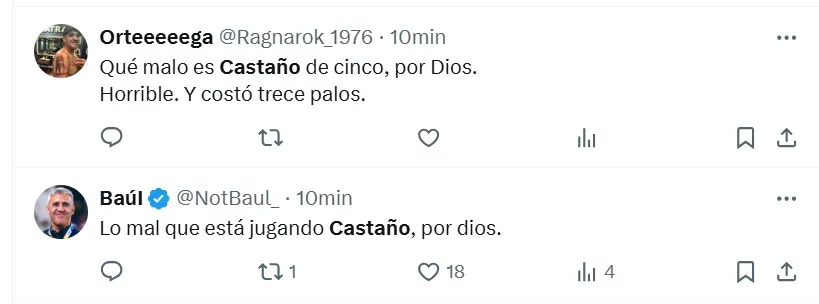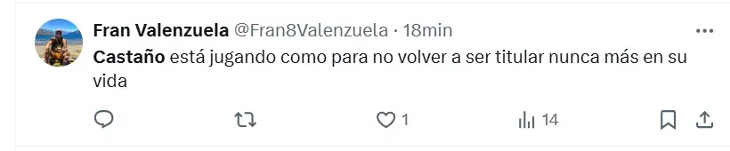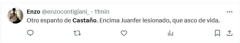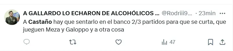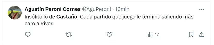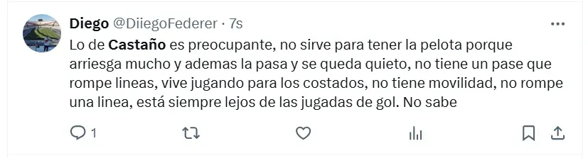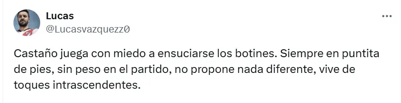 Además, otros descargos que se repitieron constantemente en X (ex Twitter) fueron: “Juega con miedo de ensuciarse los botines”, “no propone nada diferente”, “es un desastre”, “salió 15 millones de dólares”, “cada partido que juega le termina saliendo más caro a River”, “es preocupante”, “hay que sentarlo en el banco de suplentes” y “es inentendible”.