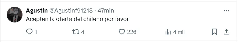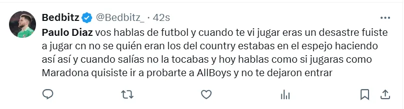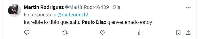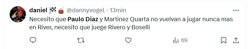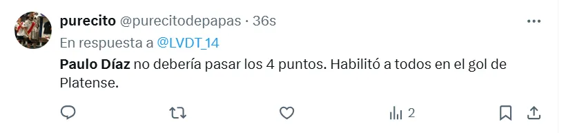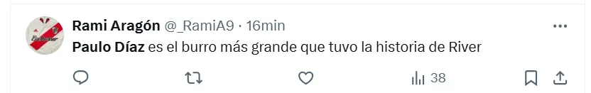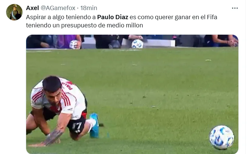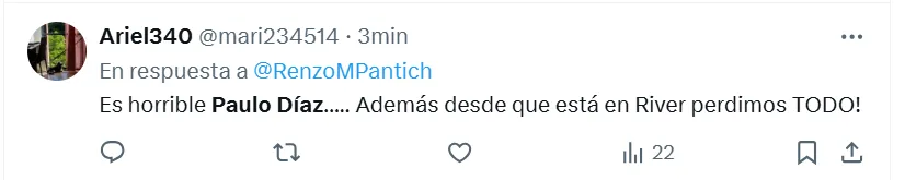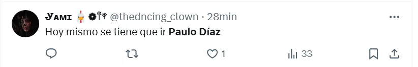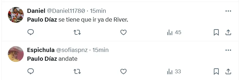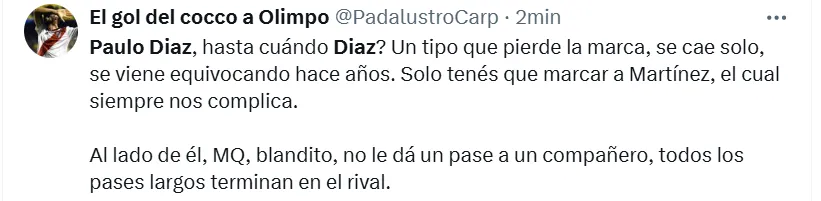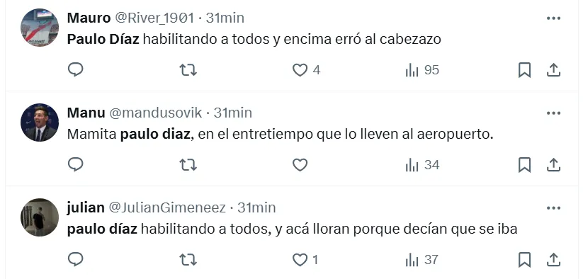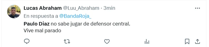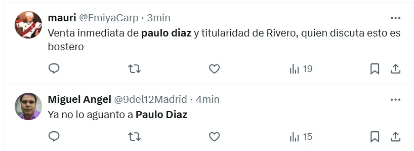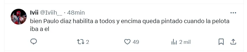 Algunas de las frases más destacadas que dejaron en X (ex Twitter) fueron las siguientes: “Hoy mismo se tiene que ir Paulo Díaz”, “andate”, “venta inmediata y titularidad a (Lautaro) Rivero”, “acepten la oferta del chileno por favor”, “está haciendo un partido horrendo”, “no sabe jugar de defensor central”, “se cae solo, se viene equivocando hace años” y “ya no lo aguanto”.