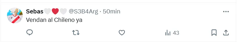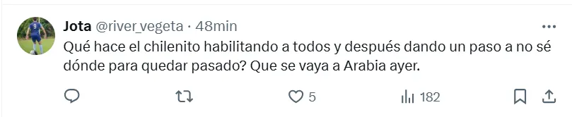 Prácticamente sin excepción, el chileno fue el receptor de cada una de las críticas que hicieron los hinchas en las redes sociales más importantes. Sus últimas actuaciones con la camiseta riverplatense no fueron las mejores, por lo que este error no hizo más que incrementar el malestar. Además, el resto de sus compañeros tuvieron un gran partido y eso le jugó en contra.