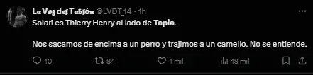 Un usuario en X expresó: “Solari es Thierry Henry al lado de Tapia. Nos sacamos de encima a un perro y trajimos a un camello. No se entiende”. Otro, a tono con esto, señaló: “Tapia te hace extrañar a Solari, nunca me imagine decir esto”. Ya sin la comparativa con el ex Colo Colo, más de un hincha expresó su enojo directamente hacia el rendimiento del flamante refuerzo ofensivo: “Algunos movimientos de Tapia te hacen dudar si tiene nivel para nuestro fútbol”.