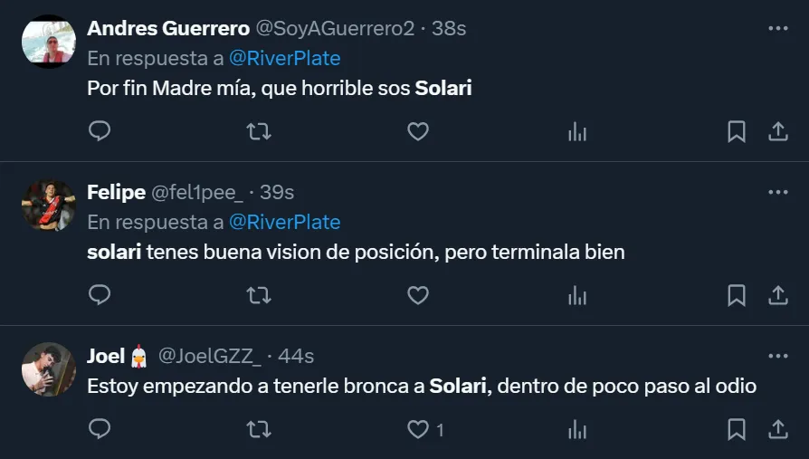 Cabe destacar que Solari no estaba al 100% desde lo físico, ya que llegó con lo justo por una molestia muscular que lo tuvo entre algodones durante toda la semana, y que provocó que Martín Demichelis analizara si lo colocaba desde el inicio o si en su lugar iba a estar Facundo Colidio. Pese a que en la prueba previa al triunfo de River respondió con creces, a lo largo de los 90 minutos su desempeño fue muy bajo, y los hinchas se lo hicieron saber.