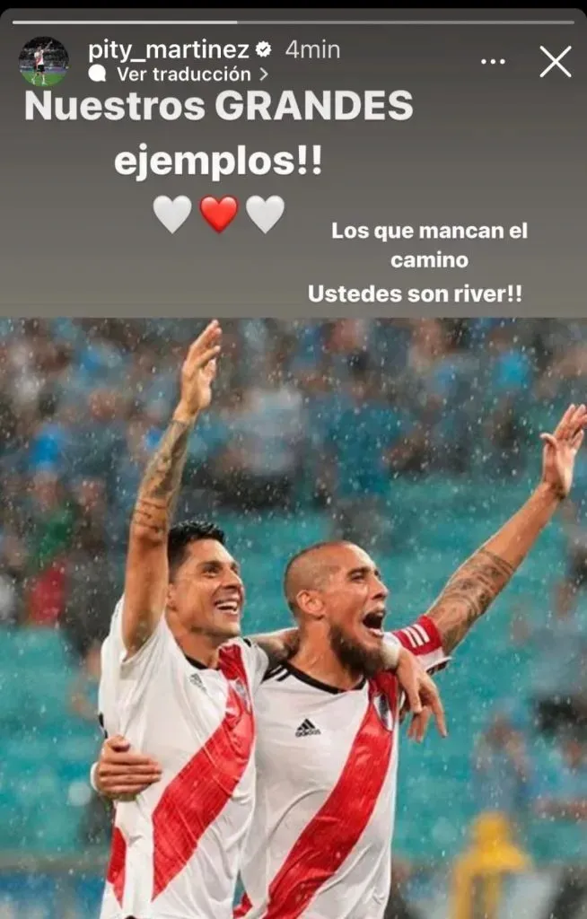 Demostrando lo que significaron tanto Enzo Pérez como Maidana para la historia de River, Martínez publicó una story en la que homenajea a los ídolos: “Nuestros grandes ejemplos… ustedes son los que marcan el camino. Son River”, escribió.
