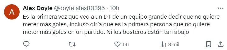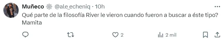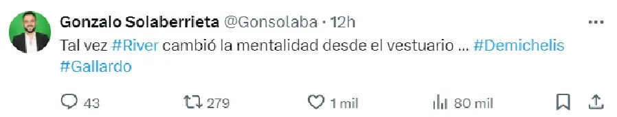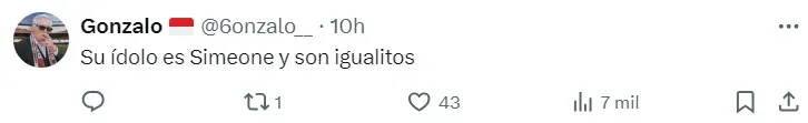 Teniendo en cuenta que River no pudo mantener lo bueno que había hecho en el primer tiempo, muchos simpatizantes usaron el video para cuestionar al técnico. “Perdón, Muñeco”, “no me hagas llorar”, “es Simeone”, “¿qué parte de la filosofía River le vieron?”, “cambió la mentalidad”, fueron algunos de los comentarios en las redes.