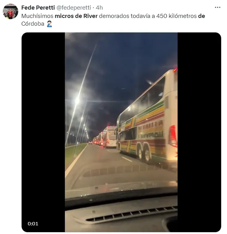 El Monumental fue el lugar elegido por la mayoría de los hinchas de River para salir rumbo al Mario Alberto Kempes para vivir el Superclásico por los cuartos de final de la Copa de la Liga. En su gran mayoría son fanáticos que van en los clásicos micros doble piso con capacidad para 60 personas. La cita fue a la medianoche del ya domingo 21 de abril, pero hubo algunas demoras imprevistas y la ruta recién la agarraron a las 2 de mañana, unas 13 horas y media antes del gran partido.