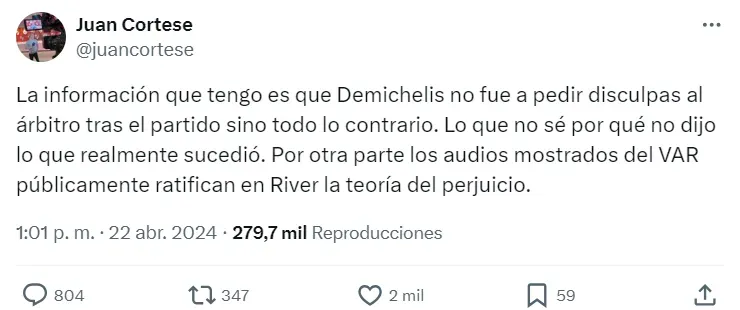 El primero en hablar del tema fue el periodista Juan Cortese. “La información que tengo es que no fue a pedir disculpas al árbitro tras el partido, sino todo lo contrario. Lo que no sé por qué no dijo lo que realmente sucedió“, soltó a través de su cuenta de Twitter