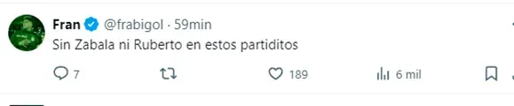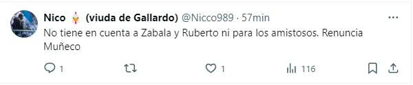 “Ni Zabala ni Ruberto, tienen más huevo que Bareiro y Fonseca”, escribió un hincha tras advertir esas dos ausencias en la nómina. “No tiene en cuenta a Zabala y Ruberto ni para los amistosos. Renuncia Muñeco”, protestó otro. “Dale, Muñeco. Aunque sea citá a los pibes”, pidió un tercero. “Sin Zabala ni Ruberto en estos partiditos”, acotó uno más.