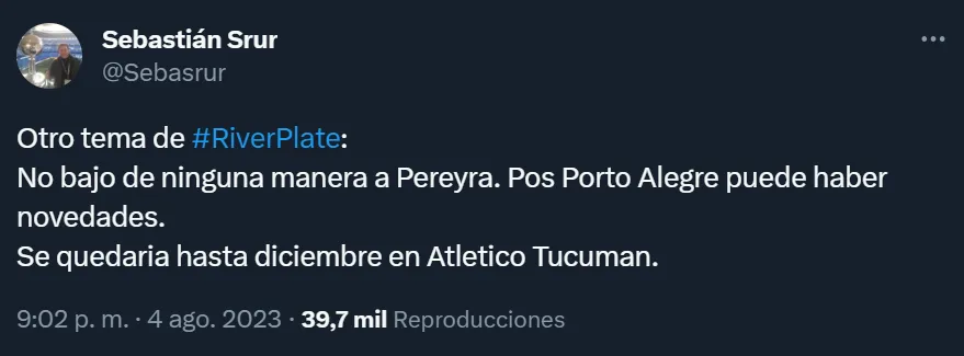 Fue el periodista Sebastián Srur quien manifestó, por medio de su cuenta de Twitter, que “post Porto Alegre puede haber novedades, no bajo de ninguna manera a Joaquín Pereyra”. Y amplió: “Se quedaría hasta diciembre en Atlético Tucumán”. De hecho, desde el conjunto tucumano buscarían vender el 80% del pase en una suma total de 4 millones de dólaress.