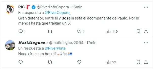 Además, minutos después de que los convocados salgan en las redes sociales, los hinchas del Millonario comenzaron a hacer viral un pedido particular a Demichelis, y el mismo es la inclusión del defensor central uruguayo, Sebastián Boselli, dentro del equipo titular.