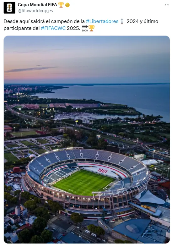 ”Desde aquí saldrá el campeón de la Libertadores 2024 y último participante del Mundial de Clubes 2025”, escribió la cuenta de X en español del organismo con base en Zurich, sobre una imagen en la que se puede apreciar la cancha de River con el Río de La Plata a sus espaldas desde una vista área.