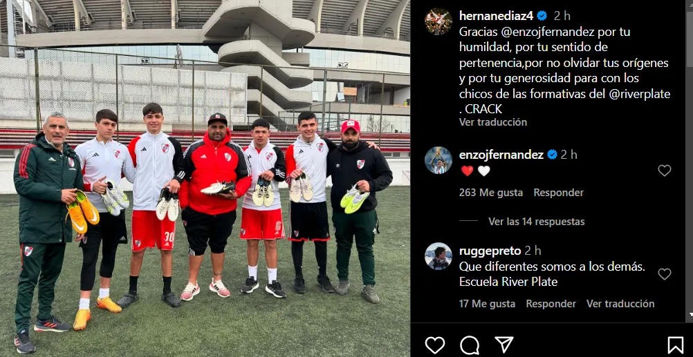 Pero, recién ahora, salió a la luz un gran gesto que tuvo el también ex jugador de Benfica durante su tiempo en Argentina. Según compartió Hernán Díaz, Enzo Fernández contribuyó con una buena cantidad de botines para los chicos que forman parte de las divisiones inferiores de la institución del barrio porteño de Núñez.