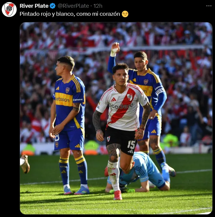 Tras la victoria en Núñez, River publicó una gastada sutil al eterno rival en sus redes sociales oficiales. Compartió una foto del festejo de gol de Driussi con Marcos Rojo y Lautaro Blanco de fondo, acompañó a la imagen con el texto: “Pintado rojo y blanco, como mi corazón”, en alusión a la canción de la hinchada, pero con los apellidos de los jugadores de Boca que aparecían lamentándose por el tanto del atacante del Millonario.
