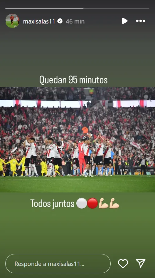 River cayó ante Palmeiras el pasado miércoles por la ida de los cuartos de final de la Copa Libertadores, pero todavía queda por jugarse la revancha, la cual será el miércoles 24 en San Pablo. El primer encuentro finalizó 2 a 1 para los brasileños en Núñez, pero la serie quedó abierta y Maxi Salas envió un contundente mensaje en sus redes sociales. Compartió una foto del equipo saludando a los hinchas y escribió: “Quedan 95 minutos. Todos juntos”.