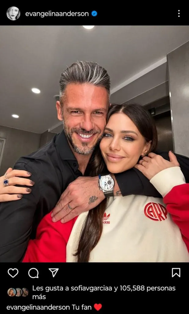Hace años que Martín Demichelis está casado con Evangelina Anderson. Juntos formaron una familia bien riverplatense y es habitual ver a la familia en el Monumental. Tras la victoria de River ante Belgrano por la segunda jornada de la Liga Profesional, Evangelina utilizó su cuenta de Instagram para apoyar a su esposo: subió una foto junto a él y escribió: “Tu fan”, acompañado del emoji de un corazón.