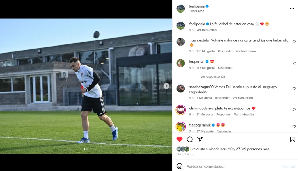 Felipe Peña Biafore, que había salido a préstamo a Arsenal a comienzos de 2023, que seis meses después pasó a Lanús -en la misma condición- fue repescado por el Millonario. El volante central compartió su felicidad en las redes sociales en su primer entrenamiento en esta pretemporada con una foto suya corriendo y escribió: “La felicidad de estar en casa”. Esa publicación se llenó de comentarios de los hinchas demostrándole apoyo y hasta pidiendo que sea titular.
