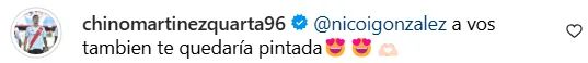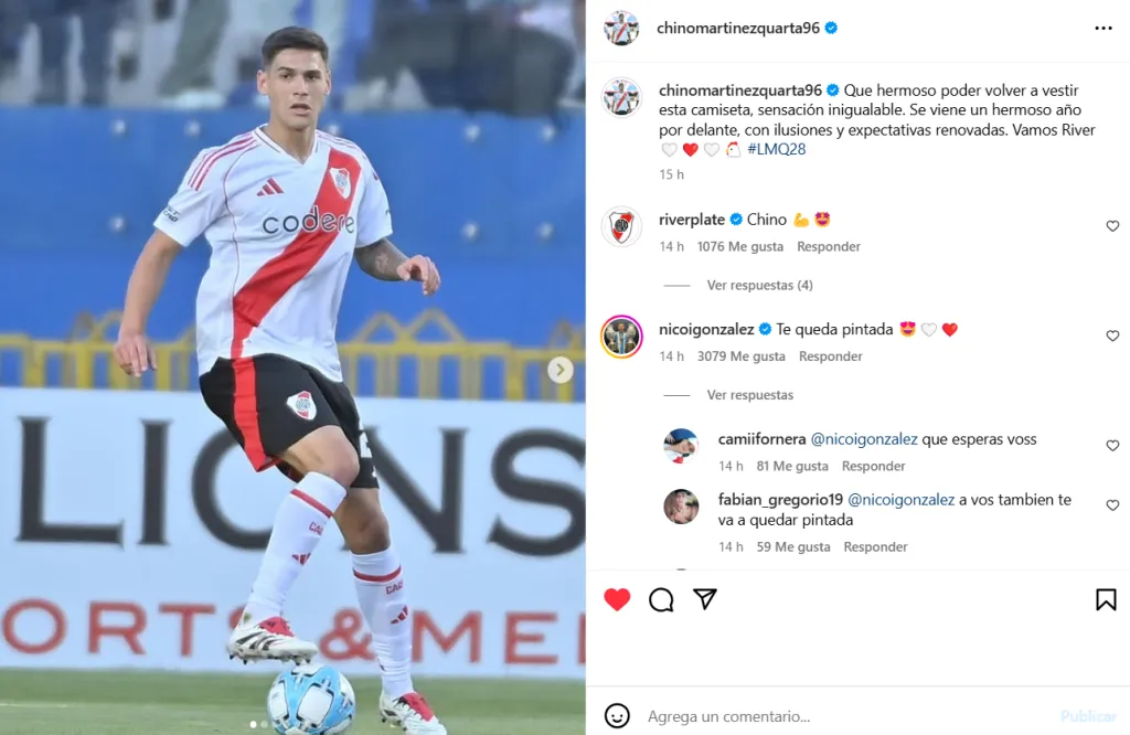 Luego del encuentro ante Universidad de Chile del pasado viernes, Lucas Martínez Quarta expresó su felicidad por volver a vestir la camiseta de River y para eso utilizó sus redes sociales. Uno de los comentarios llegó por parte de Nico González, que conoce al Chino tanto por la Selección Argentina como por haber sido compañeros en Fiorentina. Nico le escribió: “Te queda pintada” y el marcador central le devolvió la pared: “A vos también te quedaría pintada”. Conocido es que el atacante de la Juventus es fanático del club de Núñez.