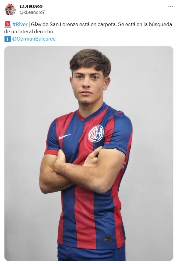 Sobre este tema habló Rubén Darío Insúa, DT del Cuervo, durante su última conferencia de prensa. “¿Giay a River? No lo veo factible. Un jugador como él… el día que se vaya de acá quiero que gane un título con San Lorenzo y luego que vaya a Europa por su proyección”, sentenció el entrenador de San Lorenzo sobre una de las grandes promesas de la institución. Por ahora, nada concreto entre clubes.