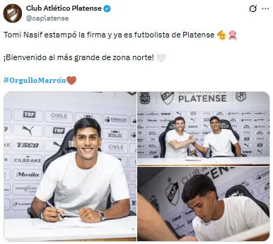 Este miércoles, el Calamar presentó a su flamante refuerzo, que llega a préstamo desde el club de Núñez. “Tomi Nasif estampó la firma y ya es futbolista de Platense. ¡Bienvenido al más grande de zona norte!”, anunció el combinado de Saavedra.
