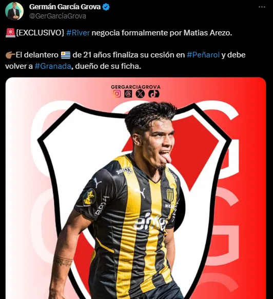 Surgido en River Plate de Uruguay y con su pase perteneciendo a Granada de España, Arezo pasó la última temporada cedido en Peñarol y debía regresar al conjunto español. Sin embargo, el periodista Germán García Grova reveló que River ya envió una oferta formal por el pase de Arezo, quien con solo 21 años podría arribar a la institución de Núñez luego de haber sido vinculado en anteriores ocasiones.
