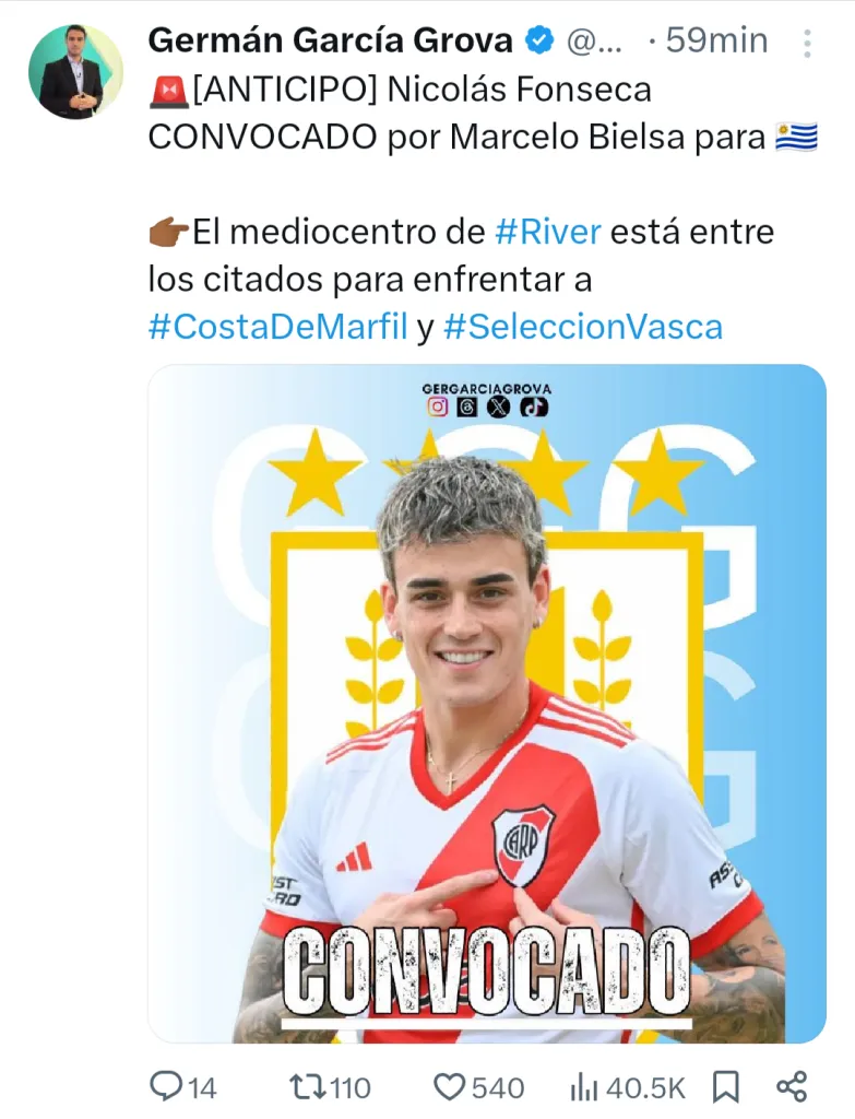 La Fecha FIFA de marzo dejará a River sin otro de los futbolistas que integran el plantel de Martín Demichelis ahora que Marcelo Bielsa se decidió a convocar a Nicolás Fonseca para los partidos amistosos que la Selección de Uruguay disputará ante la Selección del País Vasco y Costa de Marfil, el sábado 23 y el martes 26 respectivamente.