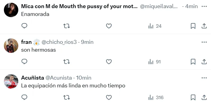 Los primeros comentarios de los hinchas a la presentación que hizo el Millonario dejaron clara la aceptación generalizada: “Son un escándalo las dos camisetas, por Dios. Las necesitamos todos los hinchas ya mismo”, “Hermosas camisetas, representenla como se debe”, “Enamorada” y “La equipación más linda del mundo”, fueron algunos de los mensajes que dejaron.