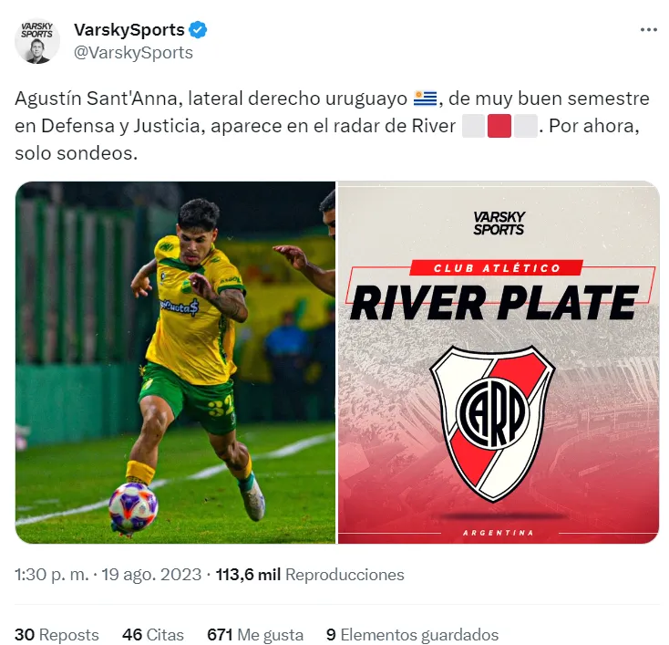 Uno de los apuntados es Agustín Sant’Anna, de muy buen semestre en Defensa y Justicia. Según informó Varsky Sports, el lateral derecho está siendo sondeado por gente del club de Núñez. Hasta el momento, no se iniciaron negociaciones por él. Dato no menor: su contrato termina en diciembre de este año.