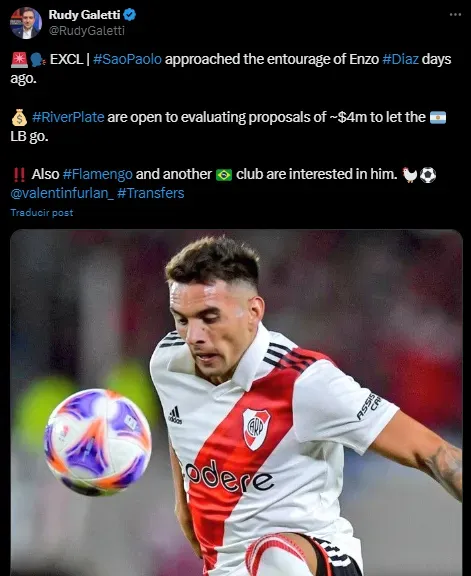 Según la información del periodista Rudy Galetti, el combinado paulista pretende los servicios de Enzo Díaz, pilar de la zona izquierda de la defensa del Millonario. El lateral fue indiscutido bajo el mando de Martín Demichelis y también se mantuvo como titular con Gallardo.