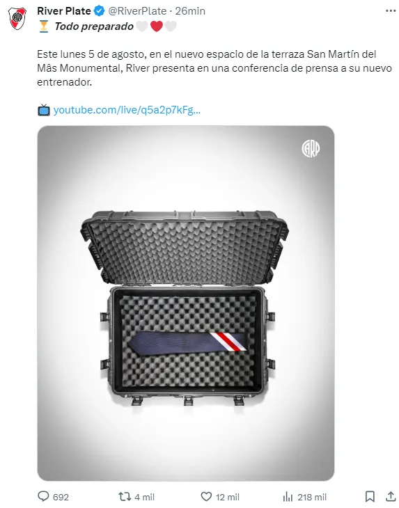 “Todo preparado”, comienza diciendo el posteo del club y agregó: “Este lunes 5 de agosto, en el nuevo espacio de la terraza San Martín del Mâs Monumental, River presenta en una conferencia de prensa a su nuevo entrenador“. Abajo, un enlace para verlo en vivo, con una transmisión que comenzará al mediodía.