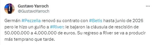 En este inicio de 2024, sobre todo después de las declaraciones del zaguero en LA NACIÓN, en Núñez se habían ilusionado con el regreso de Pezzella al club mientras todavía no había tomado una decisión sobre su continuidad en el Real Betis. No obstante, ese globo comenzó a pincharse desde el momento de la firma del defensor para renovar en España. Su vuelta al fútbol argentino sigue siendo una incógnita.