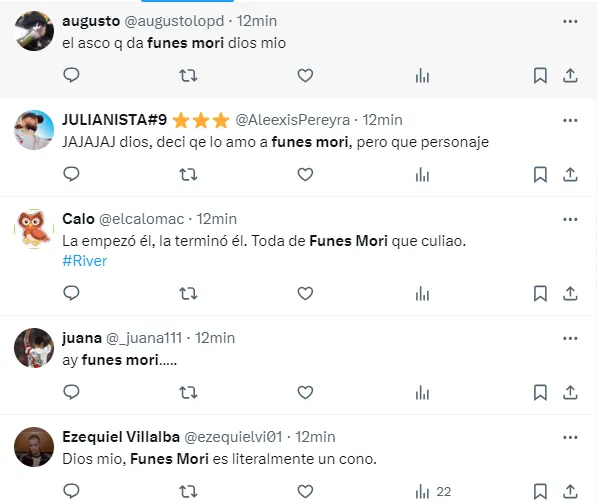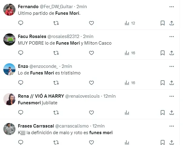 “Dios mío, Funes Mori es literalmente un cono”, “El asco q da Funes Mori dios mío”, “Lo de Funes Mori es tristísimo”, “Muy pobre lo de Funes Mori”, “Funes Mori jubilate”, “Que limitado es Funes Mori”, fueron algunas de las críticas de los hinchas del Millonario para con el defensor central.