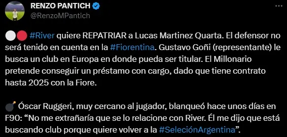 De esta manera, el River de Martín Demichelis comienza a correr cada vez más rápido en esta carrera ya que, como Martínez Quarta busca volver a la Selección Argentina, si no aparece un buen equipo europeo podría aceptar jugar un año en la banda.