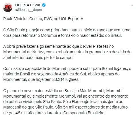 “Como prioridad para principios del próximo año, São Paulo planea un proyecto para renovar Morumbi y convertirlo en el estadio más grande de Brasil. La obra prevé hacer algo similar a lo que hizo River Plate en el Monumental de Núñez, con el descenso del césped y el descenso del anillo inferior más cerca de la cancha“, explicó el periodista Paulo Vinícius Coelho en UOL.