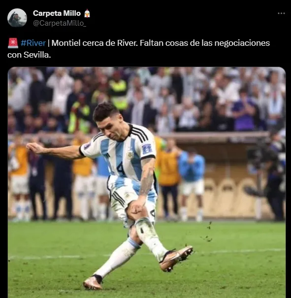Sumado a esto, en las últimas se comenzó a señalar en varias cuentas de Twitter dedicadas al mercado de pases que podría haber un acuerdo de River con Montiel. Entre estas, el usuario @CarpetaMillo (quién adelantó el arribo de Lanzini), aseguró que solo restarían detalles entre los clubes.