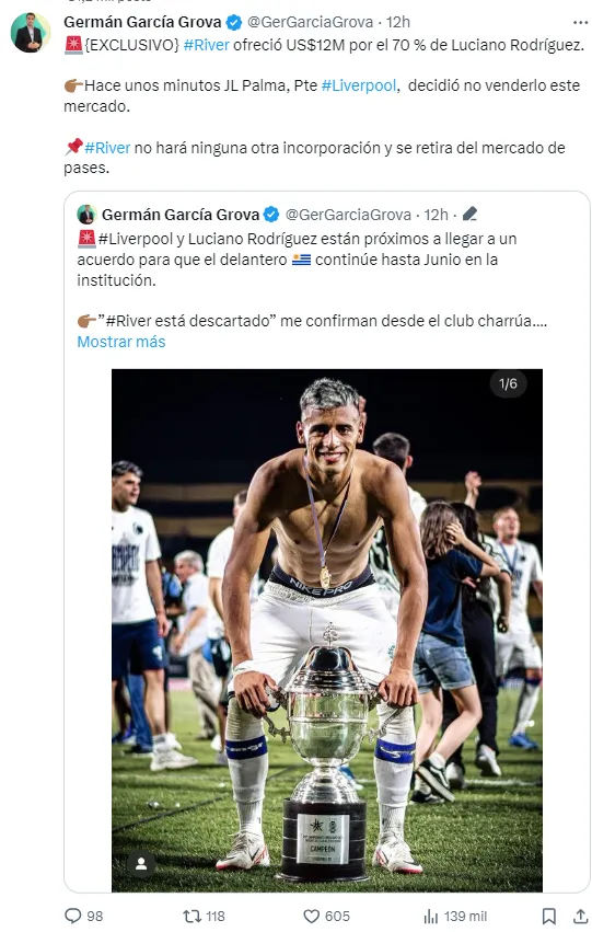 La última oferta de River por Luciano Rodríguez parecía irrechazable. El Millonario puso sobre la mesa 12 millones de dólares para contratar al delantero uruguayo, pero Liverpool tomó la decisión de no venderlo y negocia para que se quede un tiempo más. De esta manera, se tacha otro 9 en la lista de intentos del club en este mercado.