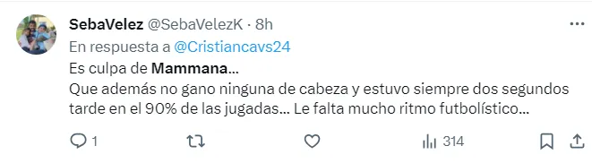 El equipo de Carlos Tevez sacó la diferencia gracias al gol de Joaquín Laso, quien cabeceó con mucha libertad tras deshacerse de Mammana, su marcador. Es por eso que varios simpatizantes del Fortín señalaron al central surgido en Núñez, que quedó en la foto del 1-0 rival.