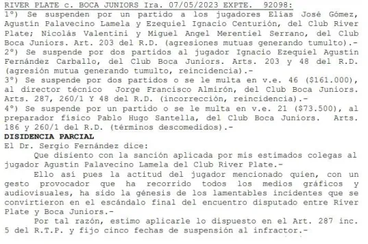 “La actitud del jugador Agustín Palavecino quien, con un gesto provocador que ha recorrido todos los medios gráficos y audiovisuales, ha sido la génesis de los lamentables incidentes que se convirtieron en el escándalo final del encuentro disputado entre River Plate y Boca Juniors”, argumenta Fernández.