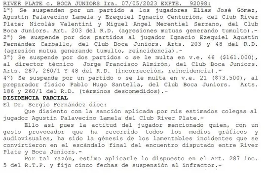 Si bien el Tribunal de Disciplina ya dio sus fundamentos para explicar por qué el mediocampistas solo se perderá un encuentro, el Boletín Oficial contó con un detalle que no pasó desapercibido. El Dr. Sergio Fernández dejó asentado que disiente con sus colegas y que pidió una sanción mucho más severa.