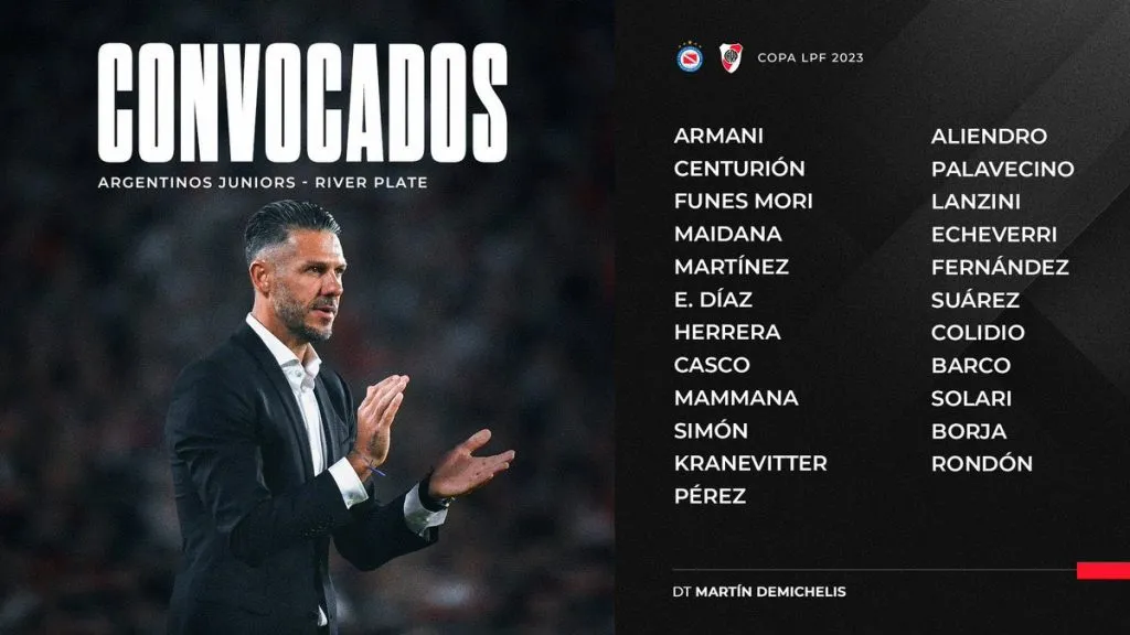Luego de lo que fue el último entrenamiento del equipo, el entrenador Martín Demichelis, dio la lista de convocados, en la que aparece por primera vez Manuel Lanzini, quien irá al banco de suplentes, y volverá a jugar en el fútbol argentino tras 9 años, mientras que el recuperado Enzo Pérez también está.