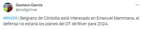 Interesados por el defensor no faltan. Uno de ellos es el último rival del Millonario, según cuenta el periodista Gustavo García. “Belgrano de Córdoba está interesado en Emanuel Mammana. El defensa no estaría los planes del DT de River para 2024”, escribió el partidario en su cuenta de X.