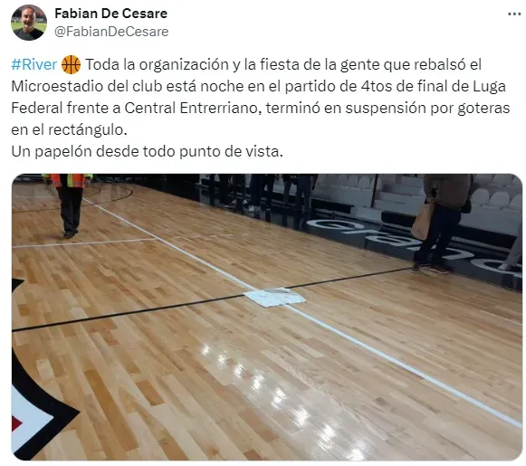Por el primer duelo de los cuartos de final de la llave Metropolitana-Litoral de la Liga Federal de básquetbol, River Plate debía recibir a Central Entrerriano este miércoles el microestadio ubicado en el Más Monumental. Sin embargo, el duelo no llegó a jugarse por un llamativo motivo.