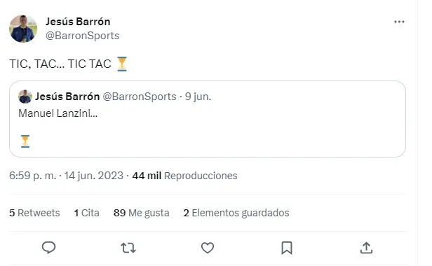 El periodista Jesús Barrón quien cubre a Rayados de Monterrey, en su cuenta de Twitter, posteó “TIC, TAC… TIC TAC”, retuiteando un viejo tuit suyo, en el que escribió “Manuel Lanzini…”, dando a entender que el arribo del argentino al equipo rayado es inminente.
