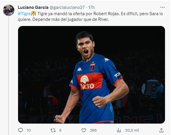 Según lo informado por el periodista Luciano García, Tigre ya le mandó una oferta a River por Robert Rojas. Además, agrega que la operación es difícil, pero el entrenador Juan Manuel Sara lo quiere, y que para que se de, depende más del jugador que del Millonario.