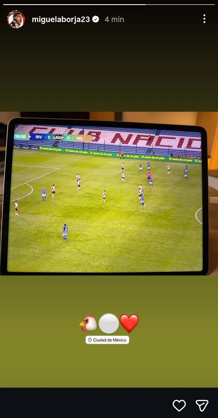 El pasado domingo, River enfrentó a Millonarios en Montevideo por el primer amistoso de 2026. Miguel Ángel Borja, que todavía tiene como foto de perfil en Instagram una suya con la camiseta del Millonario, utilizó su cuenta para compartir una historia en la que estaba viendo el partido, lo acompañó con el emoji de una gallina y otros con los colores del club.