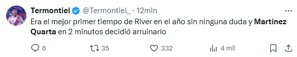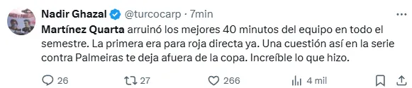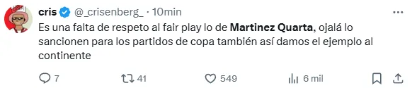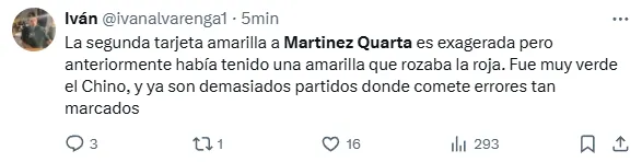El partido dio un giro luego de la expulsión de Lucas Martínez Quarta. El marcador central vio dos amarillas en tres minutos y dejó a su equipo con 10′ con todo el segundo tiempo por delante. Desde ese mismo instante, el dominio del Millonario se terminó y los simpatizantes condenaron al Chino en las redes sociales.