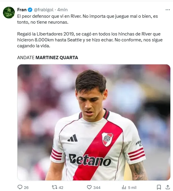 “Qué poca inteligencia”, “arruinó todo”, “es muy verde“, fueron solo algunas de las reacciones de los fanáticos riverplatenses a la tarjeta roja del defensor. Aún así, el ex-Fiorentina se perfila para ser titular contra Palmeiras el próximo miércoles en el Monumental.