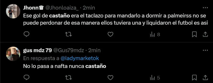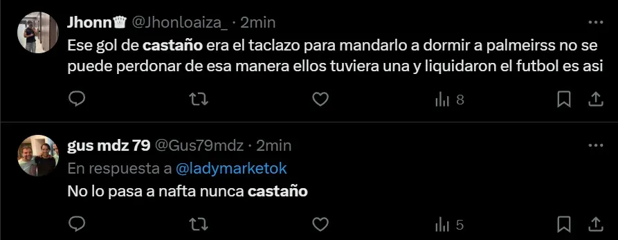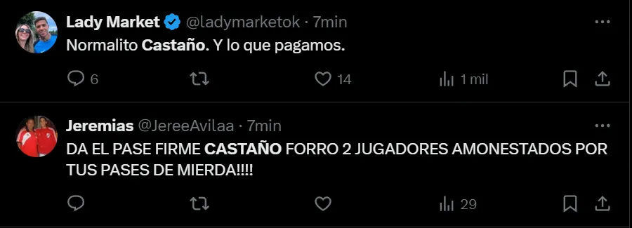 No solo le reprocharon la ocasión manifiesta de gol que falló, sino que también recordaron la gran inversión que realizó la dirigencia para contratarlo (14 millones de dólares a Krasnodar) y que, desde que arribó en marzo de 2025, no rindió como se lo esperaba. “Regalarlo a Castaño en el próximo mercado de pases, es caro…”, exclamó el usuario @MiguelOmaar en Twitter. Pero no fue el único que criticó al colombiano nacido en Itagüí.
