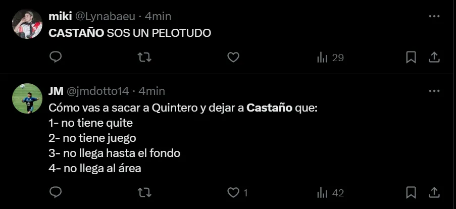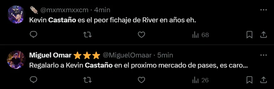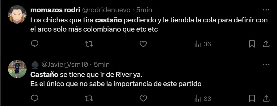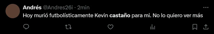 “Hoy murió futbolísticamente Kevin Castaño para mi. No lo quiero ver más”; “Castaño, 14 palos para quedar afuera”; “Castaño sos un pelotudo” y “Castaño se tiene que ir de River ya. Es el único que no sabe la importancia de este partido”, fueron otros de los tantos comentarios que se observaron en las redes sociales.