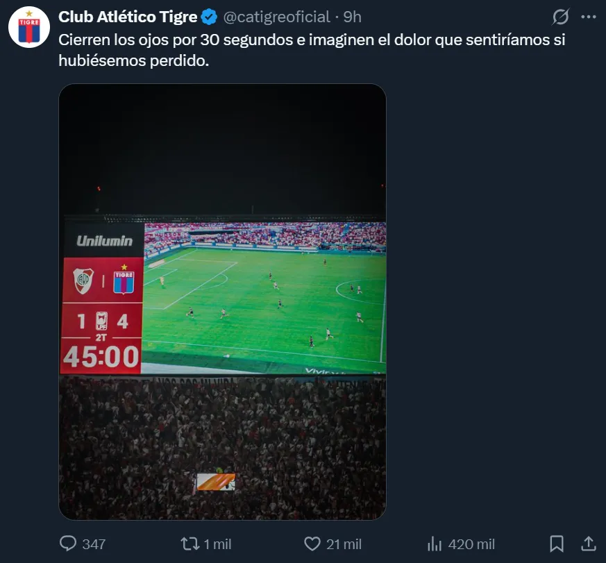 A través de su cuenta oficial, Tigre lanzó una primera gastada a River. Publicó una foto de la pantalla gigante del Monumental en la cual se veía el abultado marcador del partido y lo acompañaba una célebre frase que utilizó Gallardo para recordar la final de la Libertadores 2018 ante Boca: “Cierren los ojos por 30 segundos e imaginen el dolor que sentiríamos si hubiésemos perdido”.