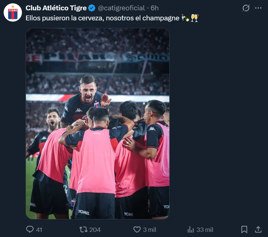 Del otro lado del mostrador está Tigre, que venía de ganarle muy bien a Racing en Victoria y que llegó al Monumental con ideas claras, concretas y sabiendo cómo lastimar a River. Los de Dabove lo hicieron y terminaron celebrando a lo grande. Quien también lo hizo fue el CM de la cuenta de X, que dejó algunas chicanas para los de Núñez.