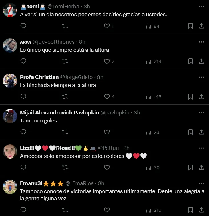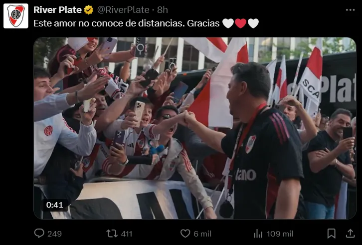 El mensaje emotivo llega sobre el final: “Este amor no conoce de distancias. Este amor es Monumental. Gracias”. Este tuit no cayó bien entre los hinchas. La mayoría expresó su enojo con el equipo por la falta de actitud, otros cuestionaron al club por no haber publicado nada sobre el aniversario de la Libertadores del 96 y, en su mayoría pedían una limpieza del plantel.